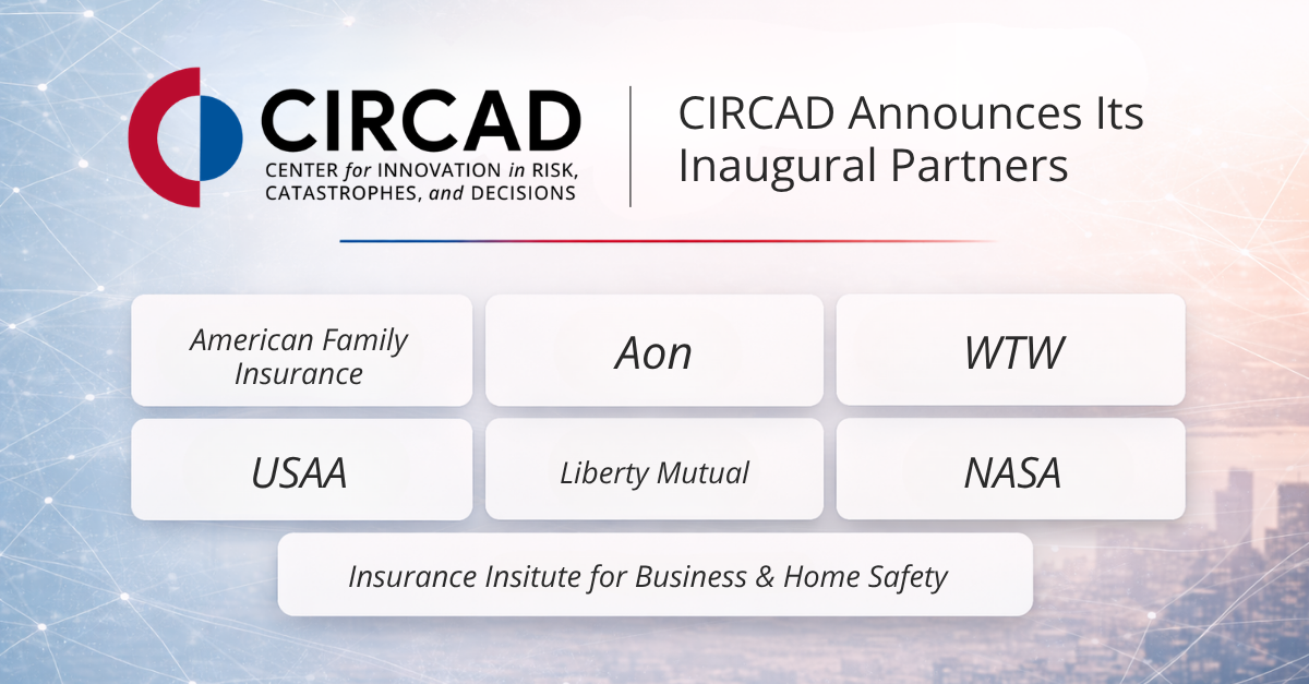 The Center for Innovation in Risk, Catastrophes, and Decisions (CIRCAD) is pleased to announce its inaugural group of partners. CIRCAD is supported by the National Science Foundation as an Industry–University Cooperative Research Center (IUCRC), a model that brings together academic research and industry collaboration to address complex, real-world challenges. These organizations represent leaders across the insurance, risk analytics, and disaster resilience sectors and will collaborate with CIRCAD to advance research addressing catastrophic risk and complex decision-making.